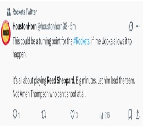 休媒:如果乌度卡能一直让谢泼德登场,那么就可能成为火箭本赛季的一个转折点,应该给谢泼德大量登场时间,让他去掌控球权,而不是给阿门那种不会投篮的球员核心席位。