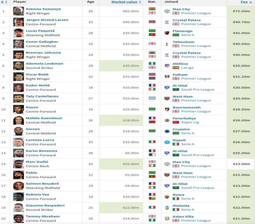 冬窗转会费前20